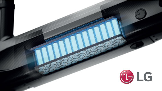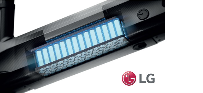 Batería extraíble de litio con celdas LG de 36V 12.8ah. La misma puede ser recargada en la bicicleta o fuera de la misma. Tiene cerradura y llave, para cuidar la seguridad de la misma. Su gran autonomía, posibilita recorrer aproximadamente 50 KM de autonomía y se carga de 3hs a 6hs (dependiendo del tipo de cargador).