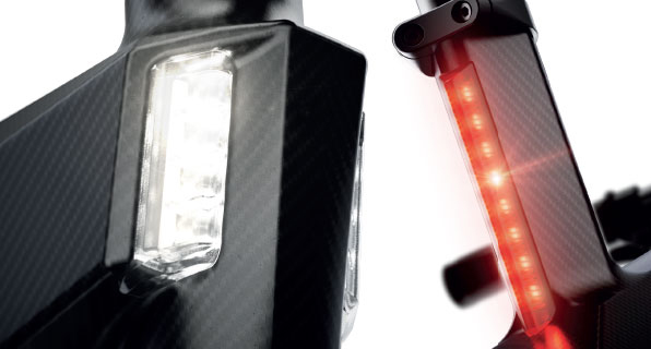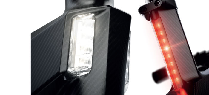Posee iluminación delantera y trasera de posición con tecnología LED de alta potencia alcanzando los 500 lumen, que proporciona una mayor seguridad en el tránsito durante la noche. Se comandan desde el joystick del display.